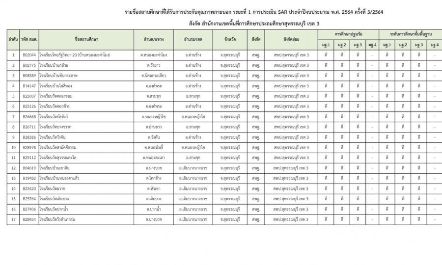 โรงเรียนวัดวังคัน ได้รับการประกันคุณภาพภายนอก ระยะที่ 1 การประเมิน SAR ประจำปีงบประมาณ พ.ศ. 2564 ครั้งที่ 3/2564 สังกัดสำนักงานเขตพื้นที่การศึกษาประถมศึกษาสุพรรณบุรี เขต 3 อยู่ในระดับดี S:0