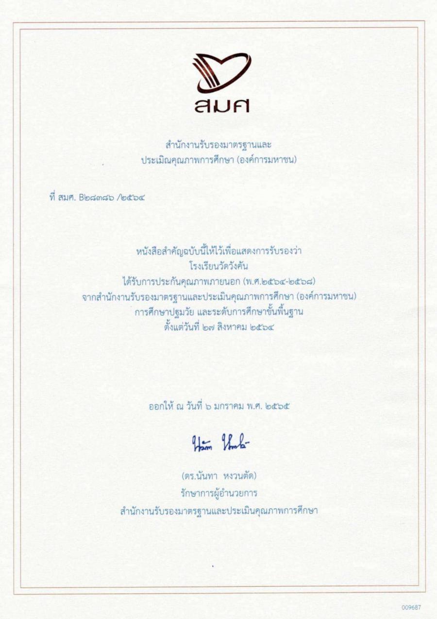 โรงเรียนวัดวังคัน ได้รับการประกันคุณภาพภายนอก (พ.ศ.๒๕๖๔-๒๕๖๘) จากสำนักงานรับรองมาตรฐานและประเมินคุณภาพการศึกษา