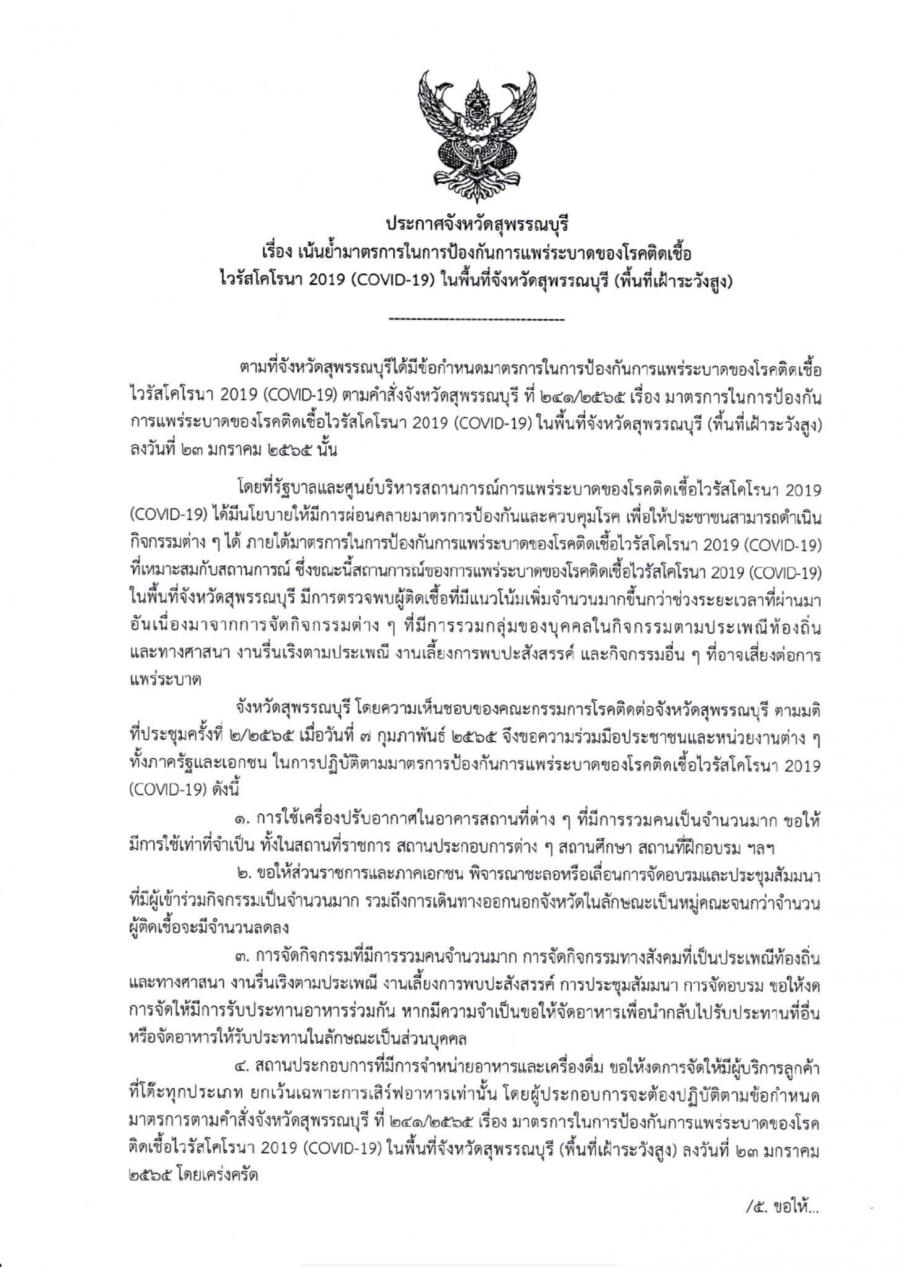 ประกาศจังหวัดสุพรรณบุรี เน้นย้ำมาตรการในการป้องกันการแพร่ระบาดของโรคติดเชื้อไวรัสโคโรนา 2019 ในพื้นที่จังหวัดสุพรรณบุรี (พื้นที่เฝ้าระวังสูง)