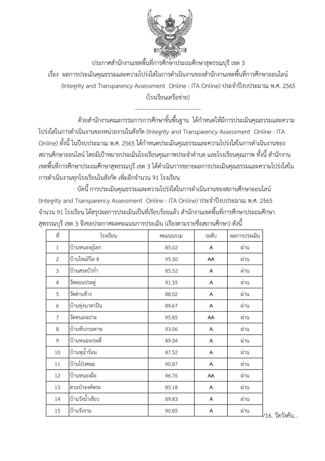 โรงเรียนวัดวังคัน ได้รับการประเมินคุณธรรมและความโปร่งใสในการดำเนินงานของสำนักงานเขตพื้นที่การศึกษาออนไลน์ (Integrity and Transparency Assessment Online : ITA Online )